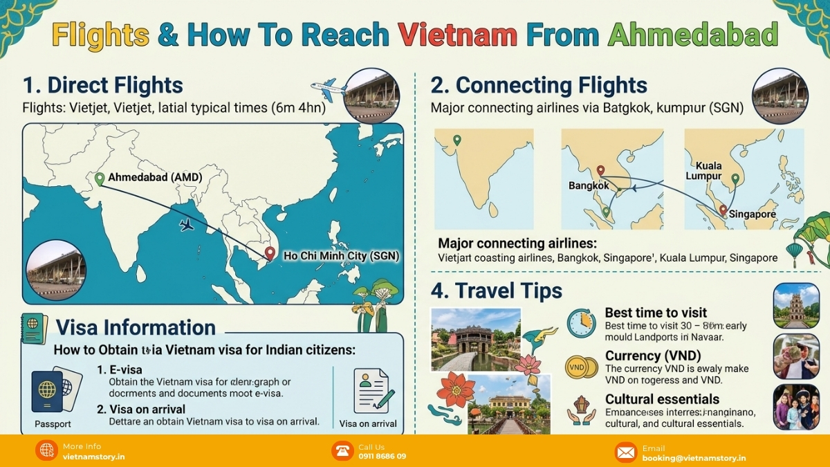 - Flight time Ahmedabad to Ho Chi Minh: A slightly longer journey of 5 hours 10 minutes to 5 hours 30 minutes.