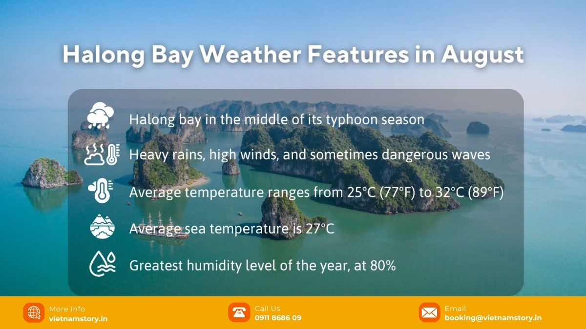 August is statistically the rainiest and hottest month in the Gulf of Tonkin. However, “rainy” in Vietnam does not mean “gloomy” all day. Instead, the weather is a cycle of intense tropical heat followed by epic, cleansing thunderstorms that leave the air crisp and the limestone karsts glowing in neon green.