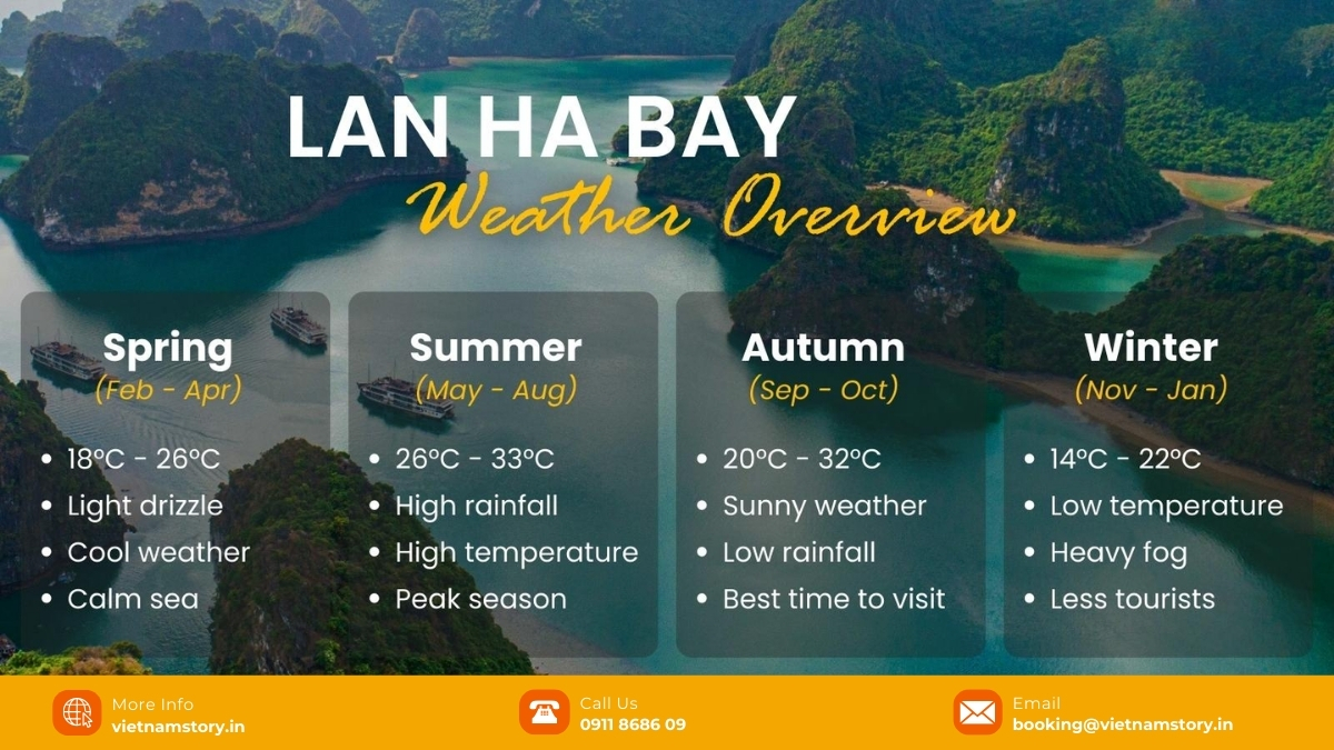 The Lan Ha Bay temperature fluctuates between 15°C and 34°C annually, governed by four distinct seasons. The best time for most travelers is the window from October to April, which avoids the heavy monsoon rains and extreme summer humidity, offering the most stable conditions for cruising and kayaking.