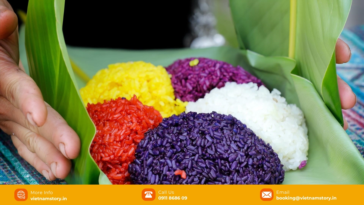 This is a true visual masterpiece and a dish you will see at every festival and celebration. The beautiful sticky rice represents the five elements (wood, fire, earth, metal, water). It is made using 100% natural dyes from local plants: a vibrant red from the Gac fruit, a beautiful green from pandan leaves, a bright yellow from turmeric, and a deep purple from magenta leaves.