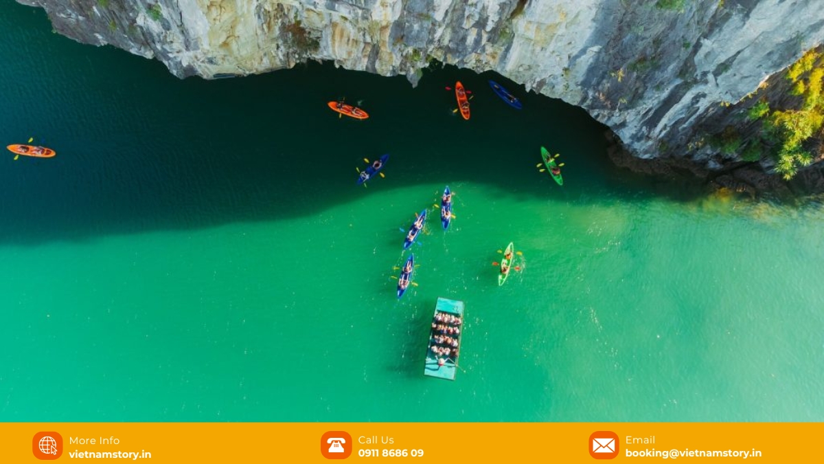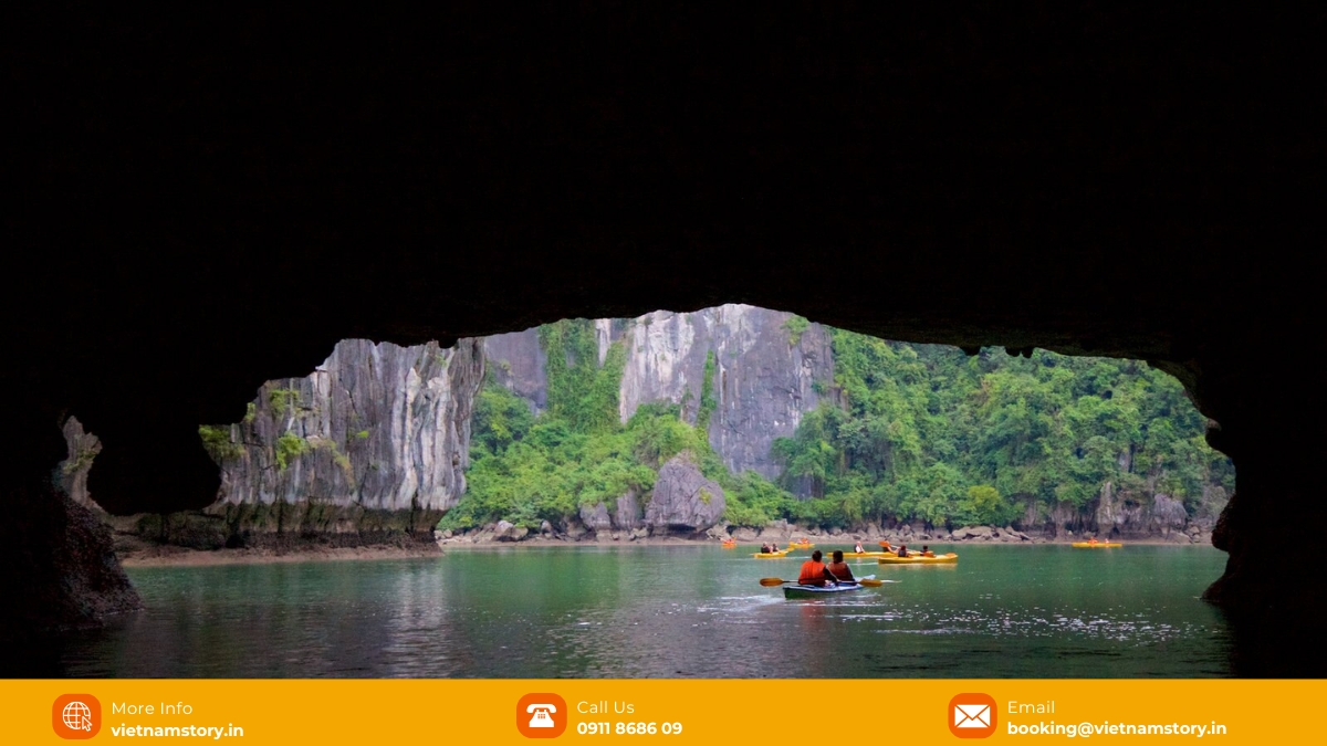 Luon Cave (sometimes spelled Luon Cave or Lun Grotto) is one of the most beloved and visually unique spots in Ha Long Bay. This is a crucial stop for any cruise itinerary. Luon Cave is a 60-meter-long water tunnel that cuts through a limestone mountain, leading into a breathtakingly tranquil, enclosed lagoon – often dubbed the “Heaven Gate” to a hidden paradise. Vietnam Story highlights Luon Cave as the quintessential Ha Long Bay kayaking or bamboo boat experience, offering Indian travelers a close, serene encounter with the bay’s natural geology and vibrant wildlife.