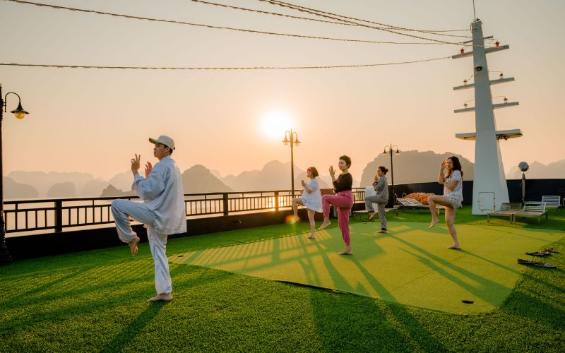 Lan Ha Bay accommodates both perfectly. For the high-energy traveler, things to do in lan ha bay include rock climbing and Deep Water Soloing (jumping from cliffs into the sea). For those seeking peace, many premium cruises now offer specialized Himalayan Yoga and Tai Chi sessions on the sundeck, perfectly aligned with the spiritual preferences of our Indian guests. Let’s look at how you can satisfy your inner adventurer or find your “Zen” in the bay.