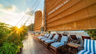 • 08.30: Transfer by tender to the “Day Boat” and begin to cruise to some of Halong Bay’s more untouched locales. Exact locations depend on tide conditions. Enjoy a leisurely day of kayaking, cave exploring and swimming. A multi-course lunch will be served mid-day. Pack lightly; swimwear and a set of dry clothes, and as there are different activities during the day bring both shoes (such as trainers) and flip-flops or sandals.
