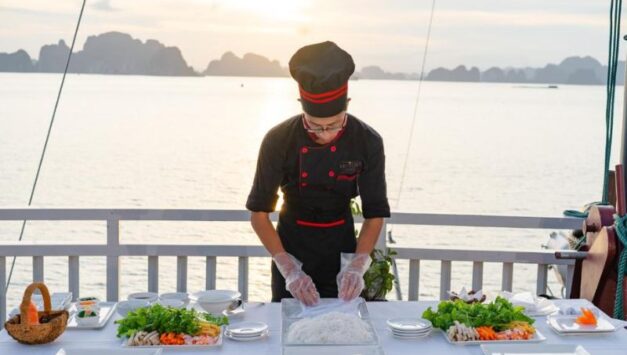 Victory Star Cruise (QN 8888) invites you on a mystical journey through the enchanting caves and crystal-clear waters of Halong Bay. Inspired by the elegance of traditional Vietnamese sailing ships, Victory Star seamlessly blends timeless charm with modern luxury, offering an extraordinary retreat. Imagine yourself lounging on the deck, gazing at the awe-inspiring sight of thousands of limestone islands rising majestically from the sea. Be captivated by the mesmerizing beauty of Sung Sot Cave, where sparkling stalactites shimmer in the soft light, or embark on an intimate adventure through the narrow Luon Cave, where only a small boat can navigate, offering a thrilling and personal exploration.